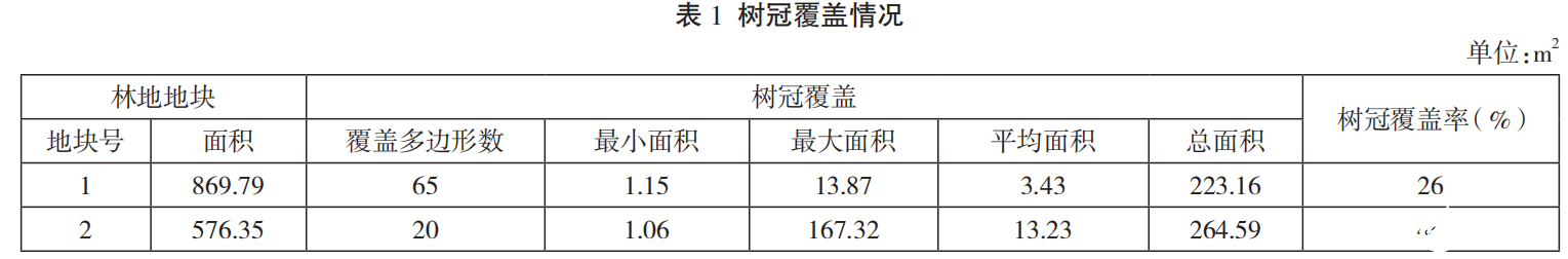 通过屏幕数字化,数字化苗圃地地块的范围,该实验区有2 个银杏苗圃地地块,建立其 GIS 数据库。将地块图层与树冠覆盖 GIS 数据图层进行空间连接分析,并在此基础上进行统计分析,得到统计结果数据,并计算出各地块的树冠覆盖率,如表1 所示。树冠覆盖率为地块内所有树冠覆盖的总面积,占该地块面积的全部。