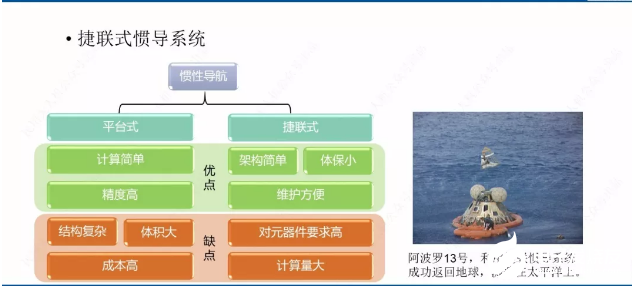 在1969年,捷联惯导系统作为“阿波罗”-13号登月飞船的应急备份装置,在其服务舱发生爆炸时将飞船成功地引导到返回地球的轨道上时起到了决定性作用,成为捷联式惯导系统发展中的一个里程碑