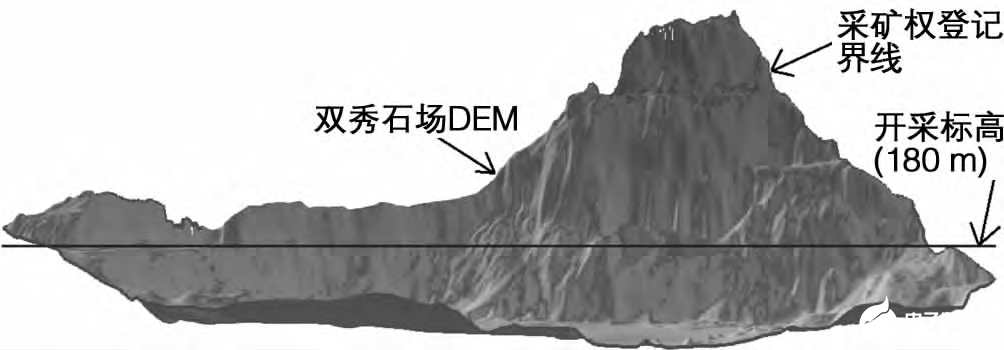 在航摄 DEM 成果的基础上,使用矿区开采边界对DEM 进行裁剪。在三炮山矿区,无越界超采情况存在,因此使用采矿权登记界线进行裁剪; 而双秀石场现场开采范围超出原有登记界线,在此采用全野外实测得到的现状开采界线对 DEM 进行裁剪。得到裁剪过的 DEM 之后,使用 ArcGIS for Desktop 软件中的“表面体积”工具计算地表面 DEM 和参考平面( 即开采标高平面) 之间的体积。