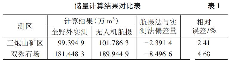 ( 2) 在南宁市兴宁区五塘镇四平村三炮山砖用页岩矿和南宁市双秀石场,无人机航摄与全野外地形测量两种成果采用同样的方法进行储量计算得到的结果相对误差分别为 2. 41% 和 4. 68%,无人机航摄计算矿产储量的可信度较高。