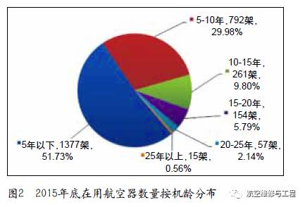 2015年底国内机队机龄分布情况如图2所示,整个机队平均机龄为6.10年,低于2014年的6.19年,自2006年以来连续9年下降。2015年在用航空器中10年以下机龄比例为81.71%,比2014年增加0.28%;10~20年机龄比例为15.59%,比2014年减少0.05%;20年以上机龄比例为2.70%,比2014年减少0.23%,25年以上机龄的航空器数量为15架,比2014年减少1架。