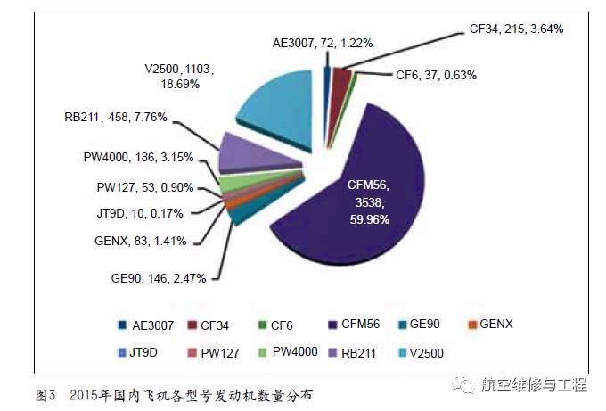 2015年底国内按CCAR-121部运行的航空公司在用发动机(含运行和备份状态)总数量为5901台,较去年增加了9.83%,其中CFM56系列、V2500系列、RB211系列、CF34系列和PW4000系列五种主要型号发动机数量为5500台,占发动机总数的93.20%,图3所示国内发动机数量最多的三种发动机型号依次为CFM56系列(59.96%)、V2500系列(18.69%)和RB211系列(7.76%)。