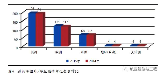 CAAC批准的国外/地区维修单位为393家(不包括CAAC认可的19家香港和澳门地区JMM维修单位),比2014年底增加了7家。与2014年底相比,2015年底美洲地区、欧洲地区和亚洲地区维修单位数量分别增加了2家、4家和1家,***地区和大洋洲地区数量保持不变,如图4所示。