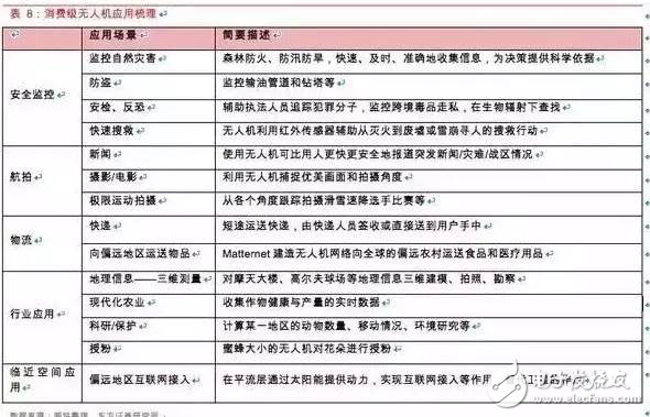 2)民用无人机一般对于速度、升限和航程等要求都较低,但对于人员操作培训、综合成本有较高的要求,因此需要形成成熟的产业链提供尽可能低廉的零部件和支持服务,目前来看民用无人机最大的市场在于政府公共服务的提供,如警用、消防、气象等,占到总需求的约70%,而我们认为未来无人机潜力最大的市场可能就在民用,新增市场需求可能出现在农业植保、货物速度、空中无线网络、数据获取等领域;