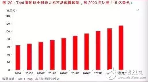 上图是Teal集团对全球无人机市场规模预测,他们预计到2023年无人机市场将达到115亿美元。