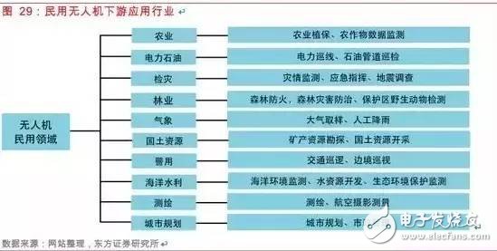 民用无人机下游需求非常广泛,包括农业、电力石油、检灾、林业、气象、国土资源、警用、海洋水利、测绘、城市规划等多个行业。近年来无人机在民用市场的应用受到越来越多的关注,如农林植保和电力巡线两个领域,无人机需求较为迫切,且具备较大的市场规模。我们认为其它行业的潜在需求也将逐步显现,我国民用无人机市场空间巨大,将进入快速发展期。