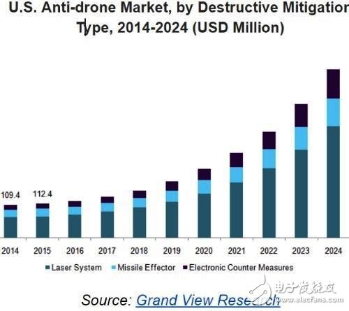 「全球反无人机技术市场在2015年规模为2.99亿美元,预期在近几年会有强劲成长;」Grand View Research表示:「该市场的主要驱动力是不断增加的未经授权无人机导致之安全漏洞案件,以及全球恐怖主义与非法活动的威胁突然升高。」