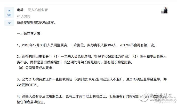 2)裁员范围之广,零度智控在2016年中完成1.5亿B轮融资,裁员前员工达到500人左右(杨建军在2016年10月接受智东西表示),此次裁员人数134人约占总人数1/4;