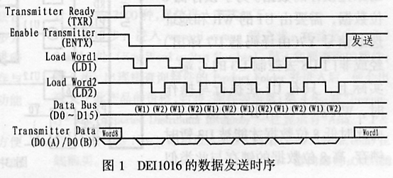 DEI1016的数据发送时序如图1所示。发送数据时,首先应查询TXR引脚是否为高电平,若是高电平,表明发送存储器已空;此时置ENTX引脚为低电平可停止发送数据,并把要发送的数据写到16位数据总线上。之后,若要发送数据字1,则置LD1为低,LD2为高;若发送数据字2,则置LD1为高,LD2为低?此时再查询TXR引脚是否为低电平,若为低电平,表明发送数据已装载到存储器中,此时再置ENTX引脚为高电平即可发送数据。DEI1016的发送存储器最多可装载8个32位字长的数据,DEI1016采用的是先进先出的发送顺序。