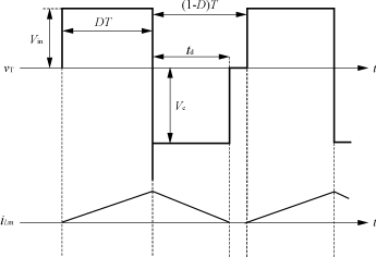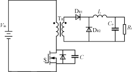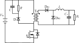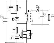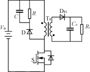 (b) 谐振复位正激变换器工作波形 图8 谐振复位正激变换电路及工作波形 图9(a)所示的是RCD复位正激变换器,即在变压器上并联了一个由二极管D,电容C,电阻R组成的环节,在开关S关断时由激磁电感和漏感的感应电势使二极管D导通,由电容C上的电压对变压器复位。图9(b)是RCD复位正激变换器的主要工作波形。电容C两端电压在一个开关周期内近似为直流电压,则RCD复位电压是一个方波。同样在开关管关断瞬间,变压器上有一个电压尖峰,是由变压器漏感与开关管结电容谐振引起的。