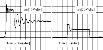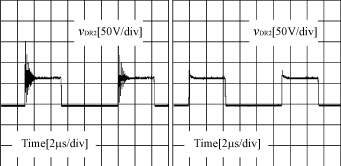 (a) Without snubber (b) RCD snubber 图6 加RCD吸收电路前后vds的实验波形