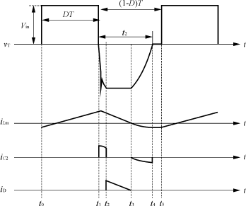 (b) 谐振复位RCD正激变换器工作波形 图10 谐振RCD复位正激变换器电路及工作波形 (1)阶段1〔t0~t1〕 t0时刻主开关S开通,变压器上承受输入电压,激磁电流线形上升。副边二极管DR1导通。 (2)阶段2〔t1~t2〕 t1时刻S关断,首先发生的是谐振复位,漏感上的贮存能量向电容C2转移,产生一个电压尖峰(这是漏感和电容C2的谐振)。然后激磁电感和漏感加在一起和电容C2谐振。因变压器上电压为下正上负,所以副边整流二极管DR1截止,续流二极管DR2导通。 (3)阶段3〔t2~t3〕 当复位电压谐振到超过C1上的电压,二极管D就导通,激磁电流流向电容C1。成为RCD复位的状态。此时激磁电流线性下降。这也保证了复位电压不会过高,从而使得开关管的电压应力得到控制。当激磁电流下降到零,该状态结束。 (4)阶段4〔t3~t4〕 激磁电流下降到零之后,二极管D就截止。但是,C2上的能量又会回馈给激磁电感,也就是说,此时是C2和激磁电感发生谐振。C2上电压下降,激磁电流反向增加。直到C2上电压下降到与输入电压相等,也就是变压器上电压下降到零,该状态结束。 (5)阶段5〔t4~t5〕 变压器上电压只要出现一个微小的上正下负的值,副边二极管DR1就导通,激磁电流流过DR1。但是该电流不足以提供负载电流,所以,续流管DR2也继续保持导通,提供不足部分的负载电流。同时DR1和DR2共同导通也保证了变压器上电压为零,激磁电流保持不变。该状态一直保持到开关管S的再次导通。 谐振RCD复位正激变换器谐振电容C2的取值应该小于谐振复位正激变换器的谐振电容C,这样在谐振复位阶段(阶段2和阶段4)复位电压的上升和下降比较快,所以在同是t2时间内完成复位的情况下,谐振RCD复位正激变换器的平台电压要比谐振复位低,接近RCD复位正激变换器的平台电压。由于C2小于C,但比开关管的结电容还是大很多,因此谐振RCD复位正激变换器变压器的电压尖峰比谐振复位的略大,而比RCD复位的小很多。从以上分析得到,谐振RCD复位正激变换器变压器的电压平台及尖峰都较低,因此,开关应力较低。而在激磁能量损耗(有部分的激磁能量回馈),开关损耗(C2<C),变压器磁偏(见各种复位方式的激磁电流波形)方面,谐振RCD复位正激变换器是谐振复位正激变换器和RCD复位正激变换器的折衷。 6 饱和电感的应用 由于该电源装置是低压大电流输入和输出,所以,二极管上的反向恢复问题相当严重,尤其是正激变换器的续流二极管DR2。图11(a)是正激变换器的DR2上的电压波形,可以看到有很高的电压尖峰。这不仅增加了损耗,抬高了所需器件的额定电压值,而且对于电磁兼容也是非常不利的。采用饱和电感和二极管串联,如图11(b)所示,可以大大削弱二极管的反向恢复,同时又不会增加很多损耗。加了饱和电感后,二极管DR2上电压波形如图11(b)所示。可以看到加了饱和电感后,DR2上的电压尖峰从将近160V降到了80V。