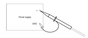图5所示为一种专用示波器探头直接与波测电源靠接。专用示波器探头上有个地线环,其探头的尖端接触电源输出正极,地线环接触电源的负极(GND),接触要可靠。