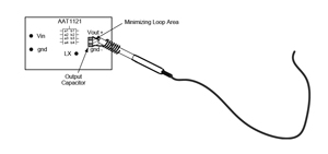 图11是用AAT1121芯片组成的降压式DC/DC转换器电路及测量正确和不正确的波形图。若采用普通的示波器探头来测量(如图12所示),由于地线与探头组成的回路面积太大(由剖面线组成的面积),它相当于一根“天线”,极易受到EMI的干扰,其输出的纹波和噪声电压相当大(见图11中右面的示波器波形图中绿色的纹波和噪声波形)。若采用专用的测量探头(如图13所示),它的地线极短,探头与地线组成回路面积较小,受到EMI干扰极小,其输出纹波和噪声波形如图11右面的红色线所示。这例子说明一般通用示波器的探头是不能用的。