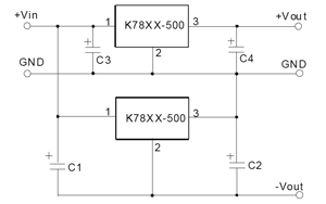 例如,用两个K7805-500开关型模块组成±5V输出电源时,若两个模块靠的很近,输出电容C4、C2未采用低ESR电容,且焊接处离输出端较远,则有可能输出的纹波和噪声电压受到相互干扰而增加,如图20所示。