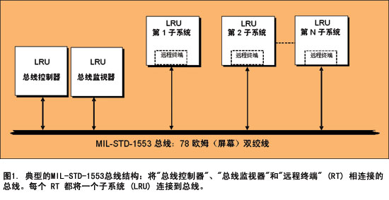 请看一下数据传输路径,即图 1 中的 MIL-STD-1553 总线结构。MIL-STD-1553 是一种定义数据总线的电子和协议特点的军用标准。作为一种在军用和商用领域广泛应用超过 25 年之久的总线,并且符合 MIL-STD-1553 标准,它能以1Mbit/s的速率高度精确、极为可靠地传输数据。