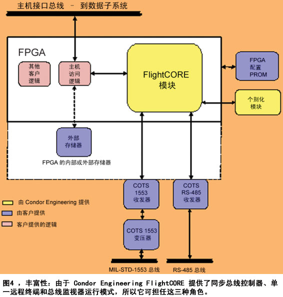 现代 FPGA 的强大功能使其成为 MIL-STD-1553 设计的理想选择,这就是 Condor Engineering 推出 FlightCORE 的原因。FlightCORE 是一种允许设计人员在各种 Altera 和 Xilinx 的 FPGA中轻松实现无版权的实例化设计的 MIL-STD-1553 IP。多数情况下,利用Xilinx 综合技术 (XST) 或 Altera Quartus II 集成综合技术 (QIS),FlightCORE 1553 可以在两天内成功地集成。如图 4 所示,用户只须将 Condor Engineering 的 IP 核心与其自身逻辑和 Condor Engineering 的个别化模块 (3mm x 3mm) 集成,即可实现高性能的 MIL-STD-1553设计。FlightCORE 还允许开发人员选择存储器的大小以恰好地与其系统需求相匹配。图4还显示了可以实施内部存贮和/或外部双端口随机存贮器。该产品还提供了 Manchester II编码与解码、信息协议验证与合法化及为接口控制和编程实施简单的共享存贮架构等所有的必要组件。只需增加外部收发器即可,如标准的COTS MIL-STD-1553或RS-485收发器。