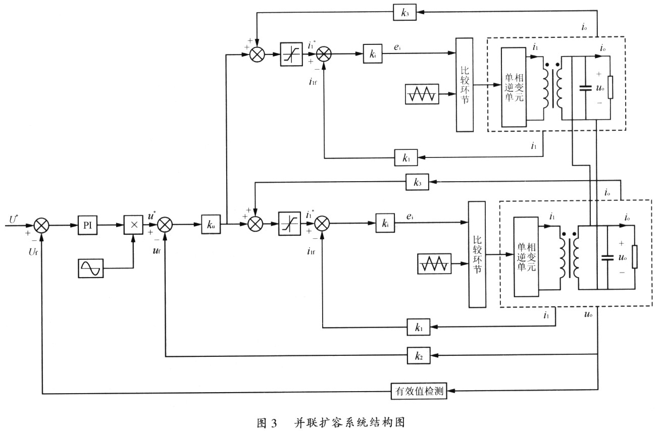 本项目采用逆变电源输出直接并联的扩容技术,系统结构如图3所示。各功率单元的控制器采用双环控制,波形控制内环采用带负载电流前馈控制的电感电流控制方式,不但实现了电源输出的截流控制,而且使单元间并联时的均流控制变得容易。并联均流控制采用主从式运行模式,一个单元为主,其余单元为从,主单元按电压模式运行,对装置输出电压的幅值、频率、相位及波形进行控制,并产生电感电流指令。从单元按电流模式运行,对系统的输出电压不进行控制,只是完成分担负载电流的任务。所有从单元的给定均为主单元产生的电感电流指令,只要各单元的电感电流控制内环增益一致,均流精度就可得到保证。从而实现整个装置的大容量功率变换。