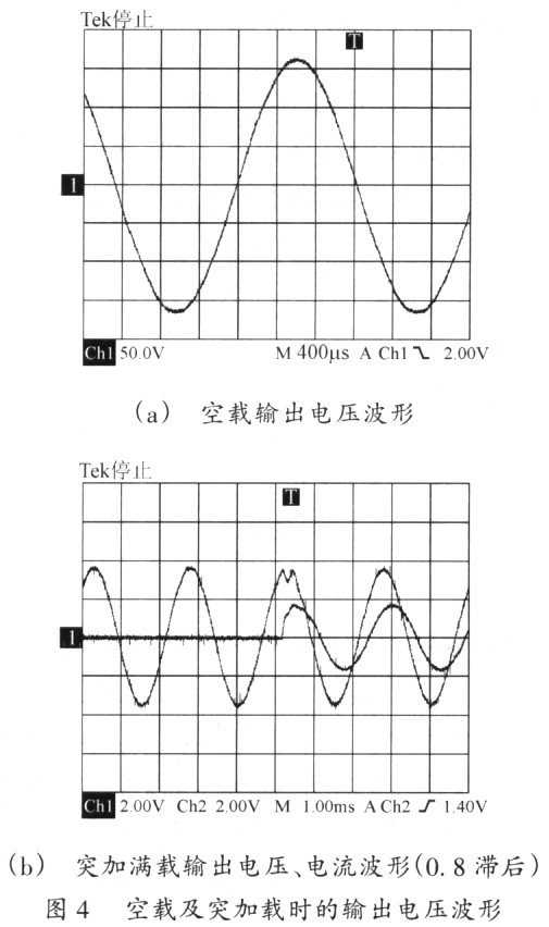 样机试验测试过程,输出电压波形如图4所示。其中的突加载波形是经过电压电流霍尔采样后的波形。