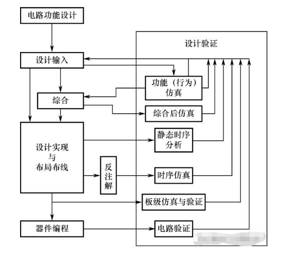 下面我们再了解一下FPGA验证流程图,FPGA的设计流程就是利用EDA开发软件和编程工具对FPGA芯片进行开发的过程。FPGA的开发流程如下图所示,包括电路功能设计、设计输入、功能仿真、综合优化、综合后仿真、实现、布线后仿真、板级仿真以及芯片编程与调试等主要步骤。