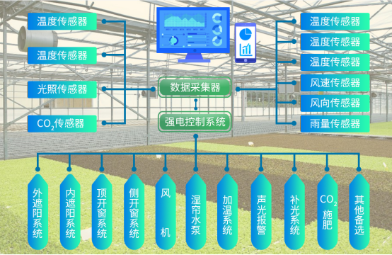 1、实时环境监测:室外温度,室外湿度,室外光照强度、风速、风向、雨量。室内多点温度、室内湿度、室内光照、CO2浓度、土壤温度、土壤湿度、水肥PH值、水肥EC值等