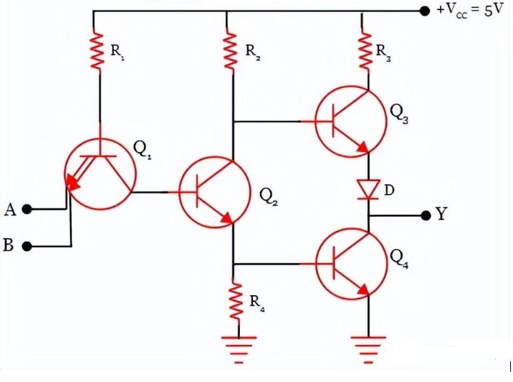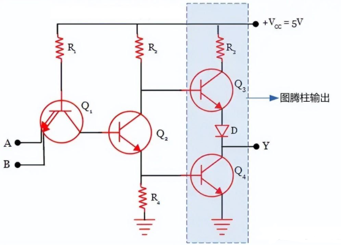 下图为2输入TTL与非门的电路图。它有四个晶体管Q 1、Q 2、Q 3和Q 4。晶体管 Q 1在发射极侧有两个输入端。三极管Q 3和Q 4组成输出端,称为图腾柱输出。