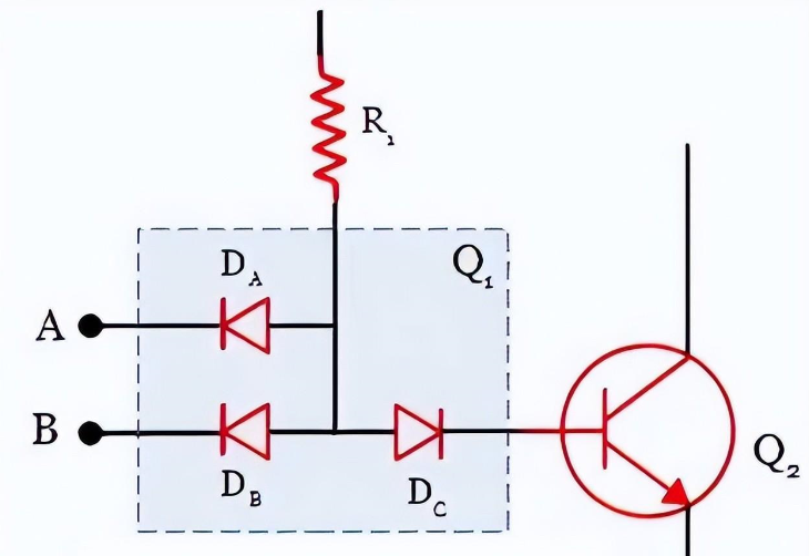 在图中,二极管DA和DB代表晶体管Q 1的2输入发射极结。二极管 DC代表晶体管 Q2的集电极-基极结。