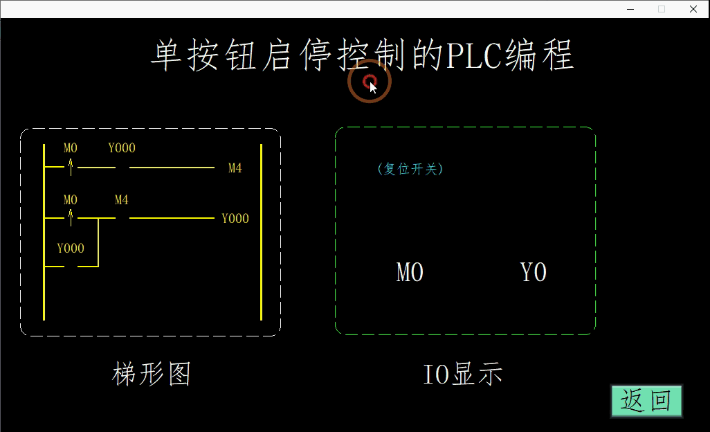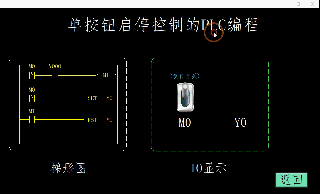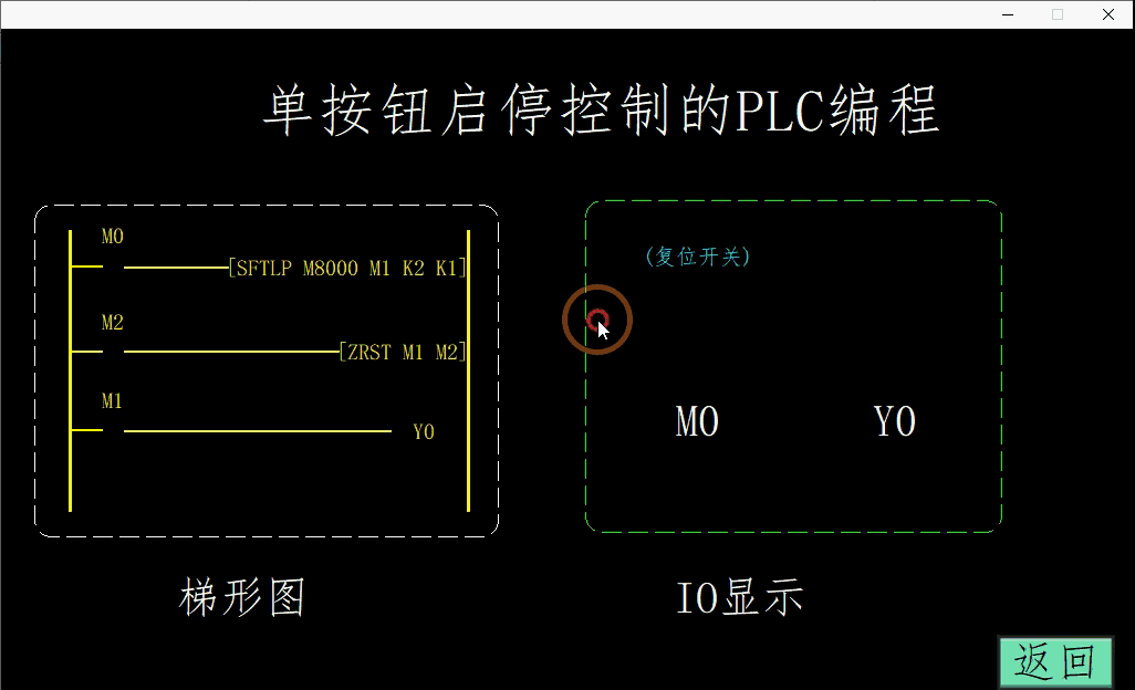 当M0闭合位置输入Y0,同时进行定时,时间到达后,常闭的T0触点断开;常开的T0触点接通,当M0再次闭合对Y0进行复位。这里没有直接对输出Y进行识别,而是通过定时器线圈来判断。