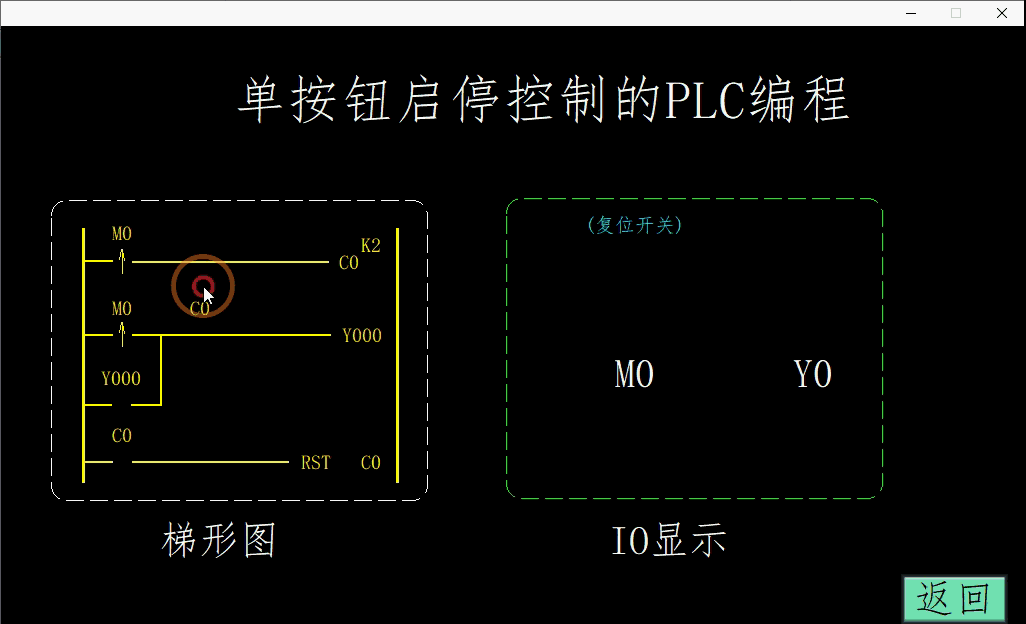 对M0的输入进行次数的检测,M0闭合一次,C0计数一次同时输出保持,当M0再次闭合时,计数器C0累加到2线圈导通,常闭的C0触点断开使得输出保持断开,同时对计数器进行复位,为下一次计数功能进行初始化。