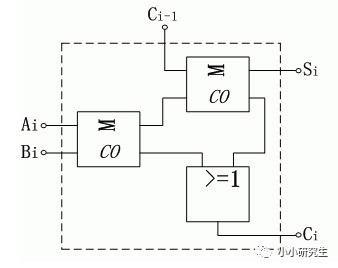 首先半加器是A+B构成了{C,S}。由于全加器多了一个低位的进位,就是将{C,S}再加上Ci-1。此时再使用一个半加器将S与Ci-1相加,结果的低位就是全加器的低位Si。全加器的高位Ci来自于两个半加器的高位,如果有一个高位为1,结果就为1。