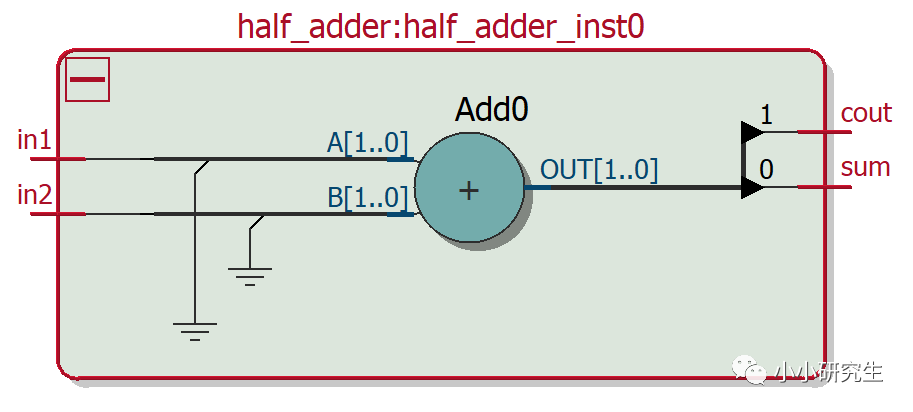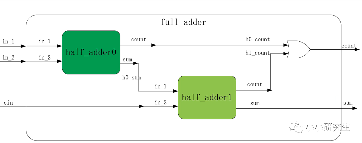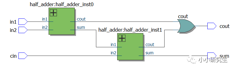 上一节中已经封装好了half_adder函数,内部的逻辑就不用再次写了,只需要将外部端口和full_adder的端口对应好就可以直接调用。这就是verilog的方便之处,否则完成这个程序,需要将半加器的代码写两次。