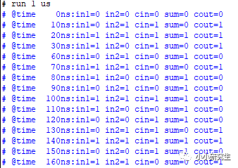 这里testbench依然是先声明变量,其中输入是reg类型,输出是wire类型。初始化令变量都为0,延时10ns给输入随机赋值0或1,然后实例化将tb_full_adder模块和full_adder模块端口进行连接,就可以观察波形。