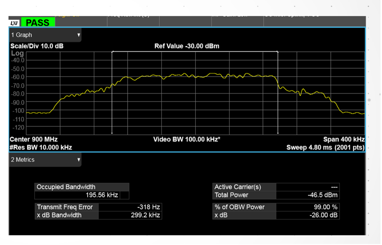 其次是信号的占用带宽OBW,即99%积分平均功率所对应的带宽。如果信号带宽不够或者过大的话,在接收端收到的信号也会出现问题。N9000B在抓取到频谱信号后,也会直接给出占用带宽的数值。