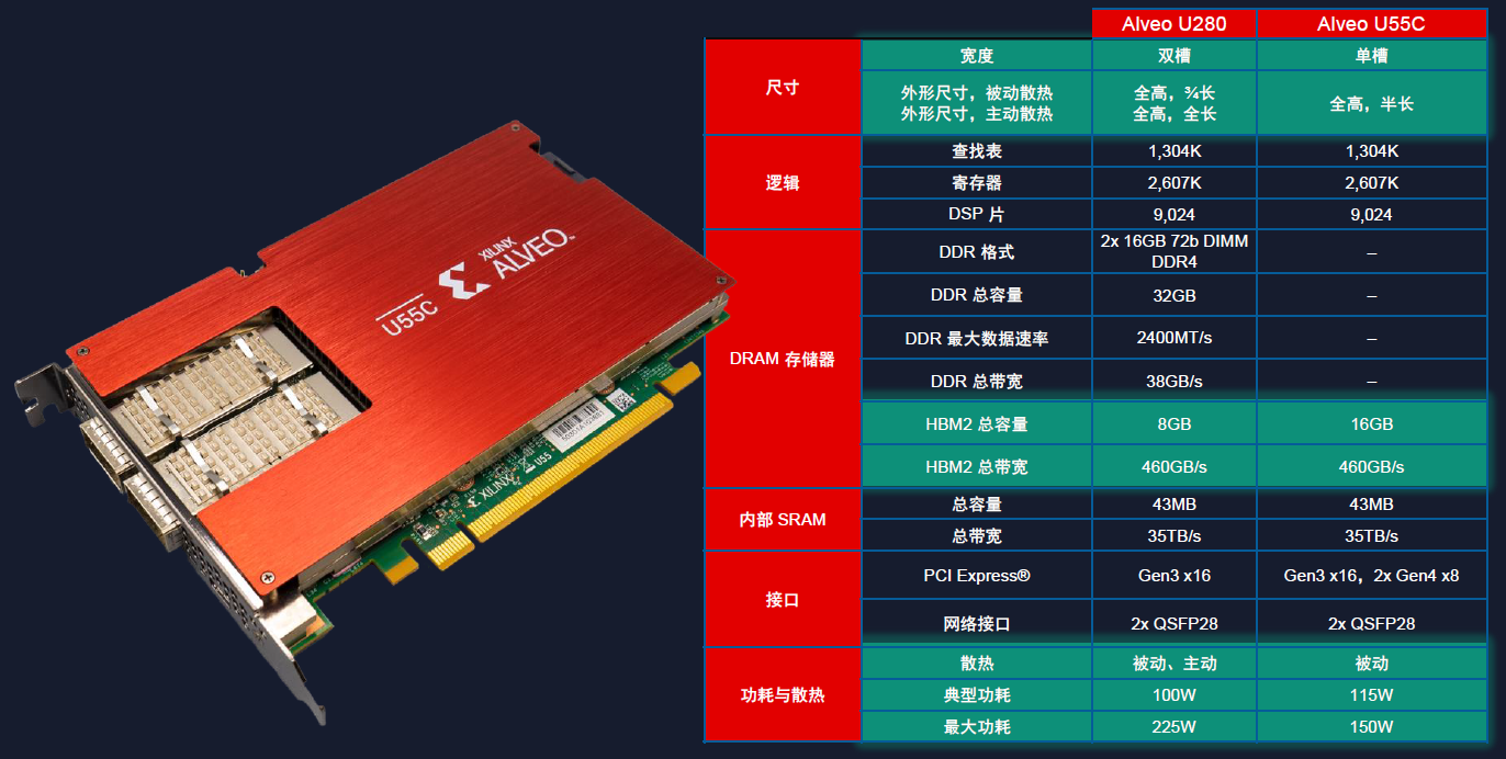 图:Alveo U55C与其前一代产品Alveo U280的参数对比