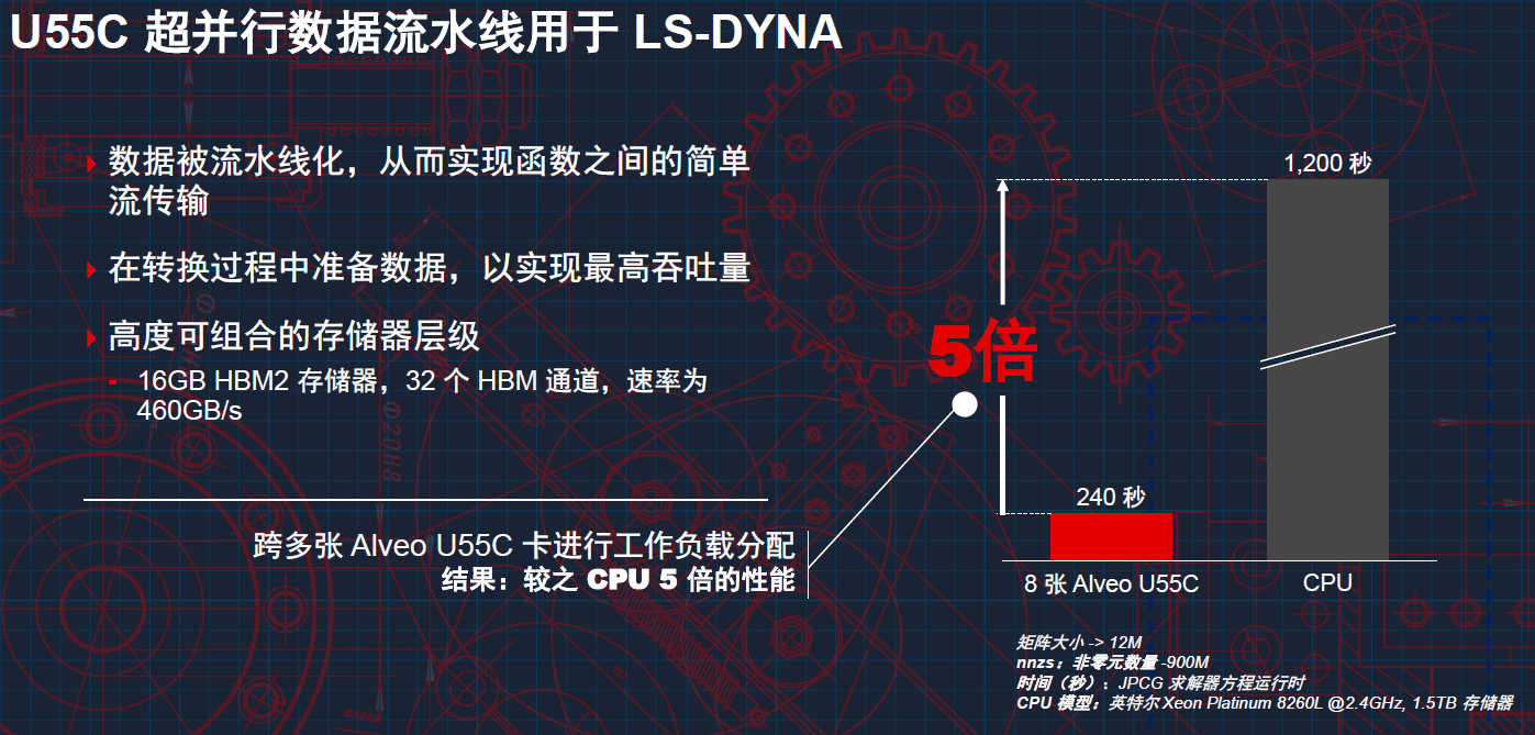 谈到Alveo U55C的应用,Nathan Chang列举了几个常用的应用场景,比如几乎每一家汽车厂商都会用到的碰撞仿真软件LS-DYNA。汽车厂商主要是用它赖进行汽车的撞击测试,以便查看仿真效果,确保汽车在设计方面的安全性和结构方面的完整性。而安全性和结构系统的设计往往取决于模型性能,因其能以计算机辅助设计有限元方法( FEM )仿真来降低物理碰撞测试的成本。FEM求解器是驱动具备数亿个自由度仿真的主要算法,而这些庞大的算法可以细分为更基本的求解器,如 PCG、稀疏矩阵、ICCG。与 x86 CPU 相比,利用超并行数据流水线在大量 Alveo 卡上进行性能扩展,LS-DYNA 能够实现超过 5 倍的性能加速。这能在一个 Alveo 流水线中提高单位时钟周期的工作效率,令 LS-DYNA 客户受益于突破性的仿真时间。