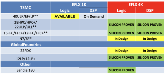 Dialog、大唐电信和波音等企业达成了合作。FlexLogic的EFLX eFPGA IP基本已经覆盖了主流的成熟工艺,比如Sandia美国国家实验室的180nm、格芯的12nm以及台积电的40nm、28/22nm、16/12nm,已完成了十数种芯片的流片。不仅如此,FlexLogic宣称格芯的22FDX和台积电的7/6nm也已经在设计阶段,下一步就是进军5nm。