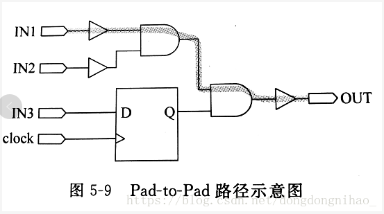 Pad-to-Pad路径从芯片输入信号端口开始,结束于芯片输出信号端口,中间包含所有组合逻辑,但并不包含任何同步逻辑如图所示: