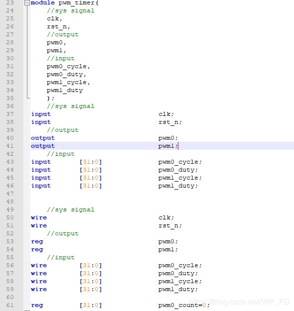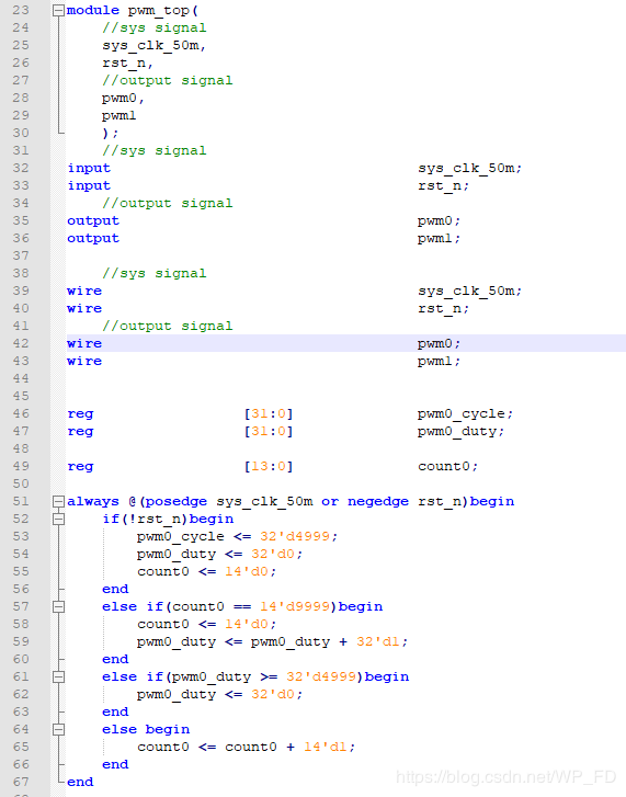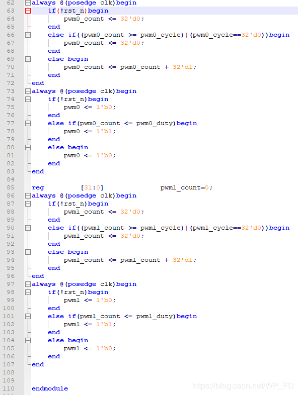 其中频率,和占空比的调节实际是调节计数值,其PWM模块代码如下所示: