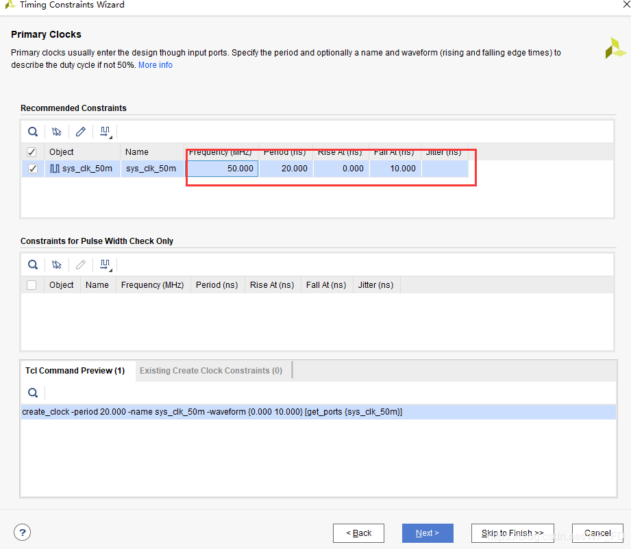 开发板时钟为50Mhz,点击Next,然后点击Skip to Finish完成时钟约束:
