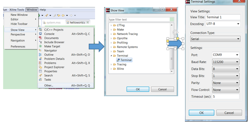 Step6: 除了使用外部的串口调试助手外,SDK内部也提供了Terminal工具。通过如下图所示的方式显示Terminal窗口且进行配置,同样可以当作串口调试助手使用,如图 28所示。