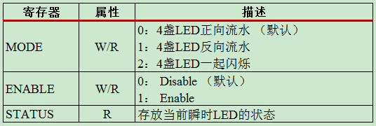 本例中所涉及的逻辑模块功能为:IP的外部接口为4盏LED,内部寄存器有3个,分别是工作模式寄存器(MODE),使能寄存器(ENABLE)和状态寄存器(STATUS),如图 29所示。