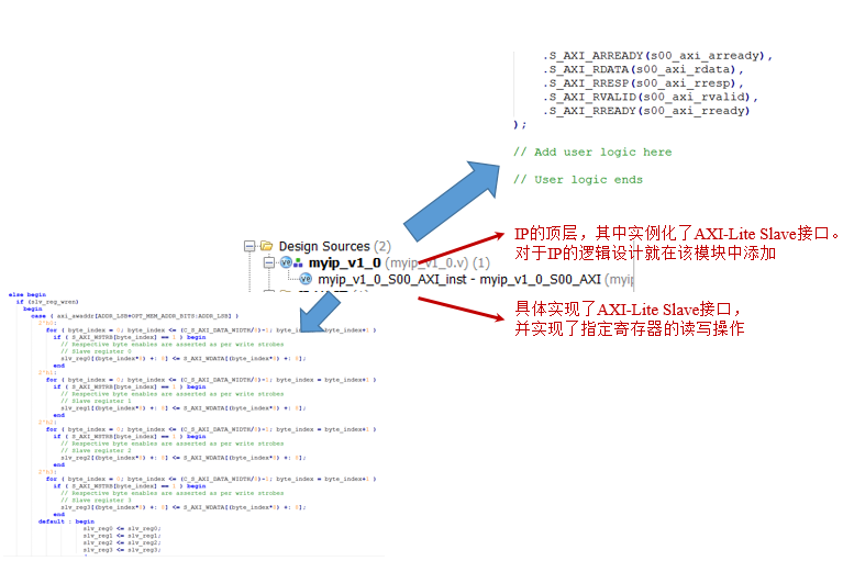 需要注意的是自动生成的代码只是简单完成了指定数量寄存器的读写时序,至于每个寄存器的逻辑功能和含义是没有的,需要用户将这些寄存器引到S00_AXI模块的上层,与用户设计的逻辑进行通信。同时自动生成的代码中所有的寄存器都是可读可写的,如果需要设置只读或者只写的寄存器,需要在S00_AXI模块中自行修改代码。