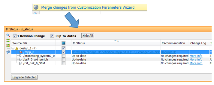IP底层修改完成之后,重新Re-Package IP后,回到Block Design中工具自动检测到IP有更新,只要通过工具的提示进行IP的更新即可。