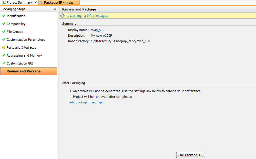 Step5: 完成IP的封装,如图 36所示,在Review and Package中点击Re-Package IP。
