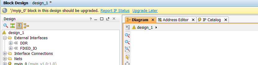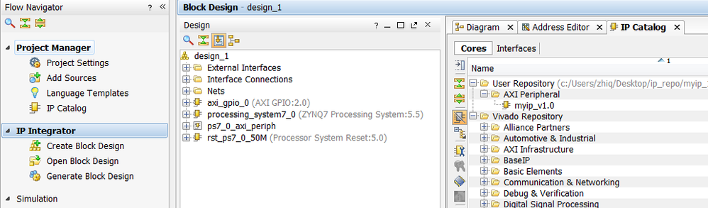 此时会关闭IP封装界面,回到ZYNQ Block Design界面。在IP Catalog中会出现刚才封装完成的IP。