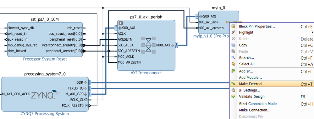 Step6: 在Block Design中需要将封装的逻辑模块IP需要引到外部的IO进行设置。