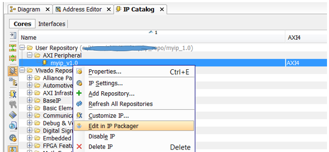 如果需要对已经设计好的IP进行底层修改,就在IP Catalog中显示的该IP处右击,选择“Customize IP”。需要注意的是,工具会默认弹出一个路径,作为修改IP的工作路径,但是该路径是一个临时路径,与之前存放IP的路径不同。
