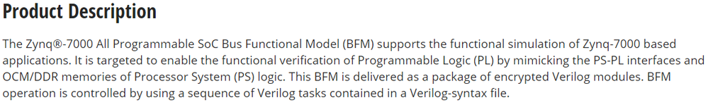 由于ZYNQ中除了常用的FPGA逻辑部分外还有ARM内核部分,所以在进行类似于FPGA设计仿真时会遇到问题,就是如果仿真ARM内核部分。Xilinx提供的一个方案是Zynq BFM(Bus Functional Model),其介绍如下。