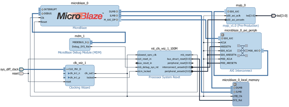 Step1: 按照“将用户逻辑设计封装成IP”中介绍的,完成Customized IP的设计和封装;在Block Design中加入MicroBlaze和Customized IP,完成Block Design设计;完成硬件平台的综合、实现、生成Bit文件,并导入SDK;在SDK中完成软件设计。综上就是完成“将用户逻辑设计封装成IP”中的Step9,区别只是用MicroBlaze替代了ZYNQ Processing System。