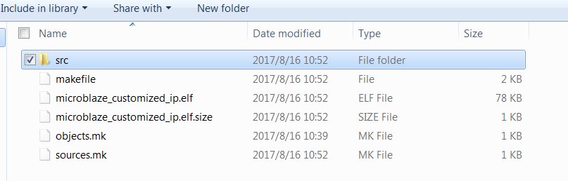 Step2:对SDK中设计的软件程序完成编译,工具自动生成elf文件。默认的存放地址为SDK project下Src文件夹中。例如:C:/***/A7_microblaze/A7_microblaze.sdk/microblaze_customized_ip/Debug